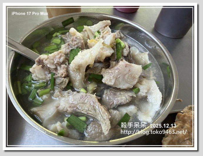 整碗湯滿滿的肉!!市區同樣價錢有一半的量就該偷笑,骨仔肉帶筋!!原本以為長時間的燉煮肉應該很軟嫩,但是實際上有一點嚼勁!!其實外帶或是內用幾乎都會店一碗,所以店家一直另外補充骨仔肉,當然也怕全部一直在鍋子裡煮到最後變爛完全沒有口感,其實很多人的吃法就是裡面加泡麵!!骨仔肉其實吃起來味道很淡,店家提提供醬油膏或是醬油和辣椒醬可以沾