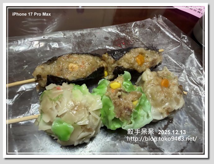 燒賣單純是吃肉!!燒賣皮都已經泡到塊爛,另外海苔肉見在傳統市場很常看見沒想到也能丟進關東煮裡!!肉見很耐煮蛋市外層的海苔就是不行