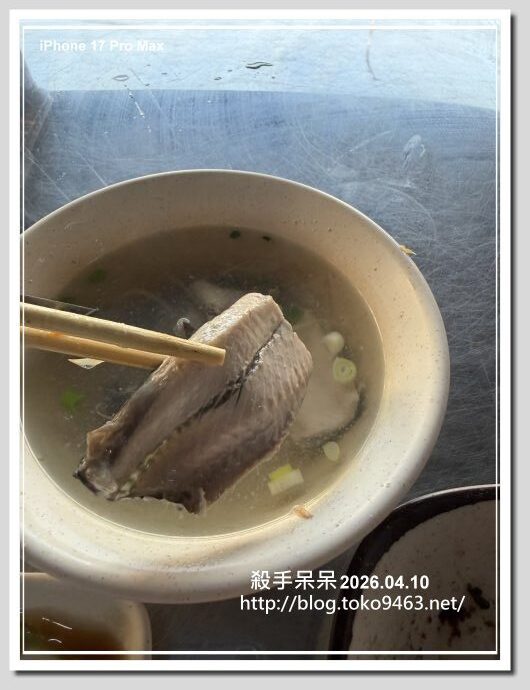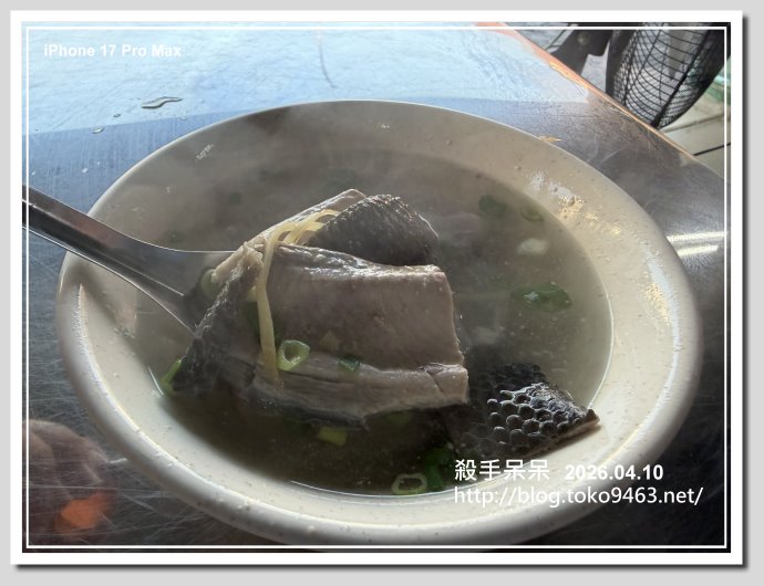 虱目魚皮相當新鮮!!湯頭喝起來米酒味略重,魚皮帶點魚肉!!但是如果有推薦魚皮湯我可能首推鳳山的錦娥肉燥飯的魚皮湯,虱目魚皮還保留大面積的魚肉