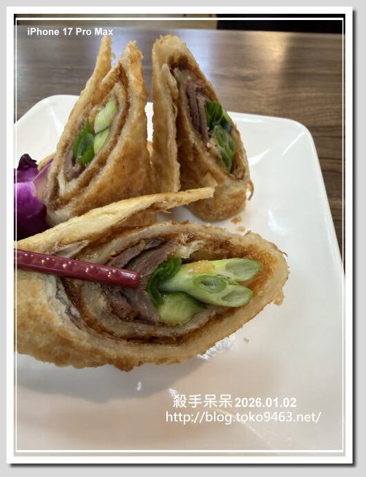 果然是沒有變的擺盤與味道!!我反而覺得捲餅比較優,捲餅用油下去炸但是吃起來酥脆但是真的不油!!尤其是甜麵醬香氣與捲餅真的很搭,小黃瓜與生蔥讓捲餅吃起來更清爽,反而內餡滷牛肉切片似乎被遺忘!!好像少了任何肉類似乎也是好像也不錯