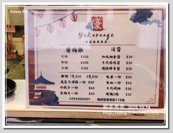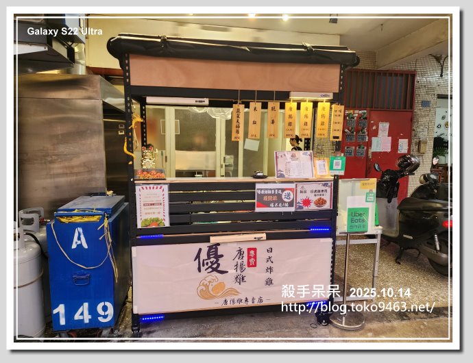不久前去楠梓加工區附近買早餐的時候!!在騎樓下看到這家攤子的菜單腦中第一反應怎麼跟我的常買的唐揚炸雞幾乎完全雷同!!正好隔天那家炸雞輪到擺攤,我在買的過程中順便詢問一下老闆!!而老闆也被我給嚇到為何會發現那家??老闆說那家店是他好朋友開的,而技術也是他教的!!既然疑問已經解決!!我就來嘗鮮,唐揚雞也是現點現炸
