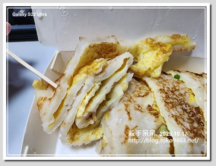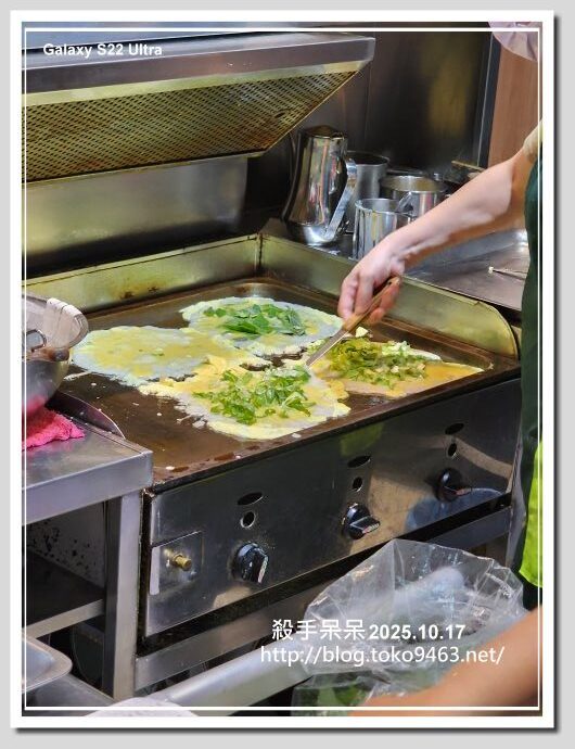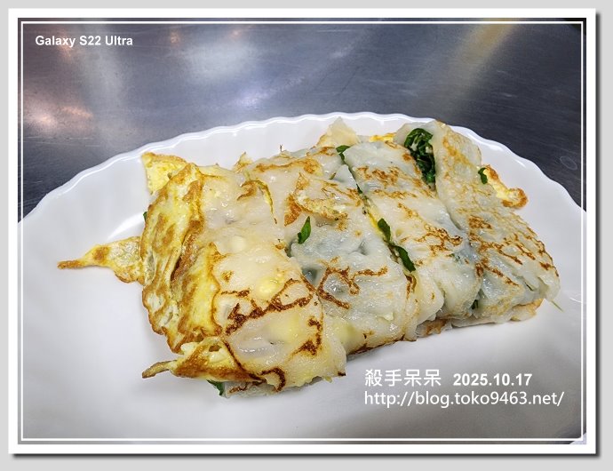 剛煎好加入九層塔的粉漿蛋餅真的很香!!這家的粉漿偏向Q彈用鐵板煎的關係,蛋餅皮外層沒有焦脆的口感!!