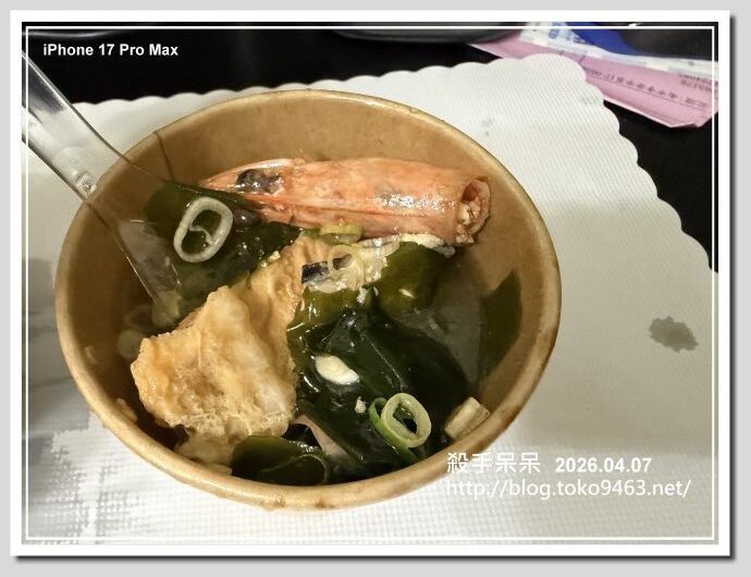 蝦頭是店內白蝦主菜剝下來的,而鮭魚的部位是中間的骨頭!!味增湯被裝在保溫的茶統理與料分開,點餐後店家在湯碗裡放入鮭魚骨.蝦頭和海帶在加味增湯進去