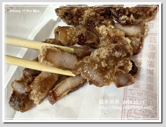 這是店家的熱銷款!!帶皮五花肉吃起來我怎麼覺得有豆腐乳的味道??五花肉本身厚度沒有很厚,瘦肉的部分略柴一點!!豬皮的部分也略乾硬