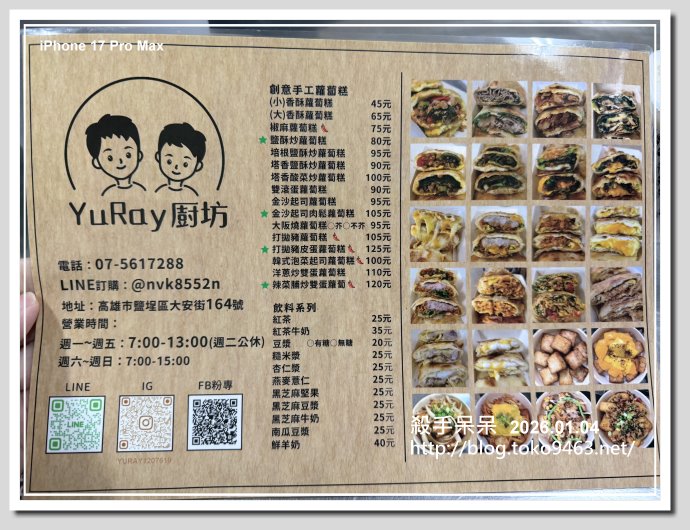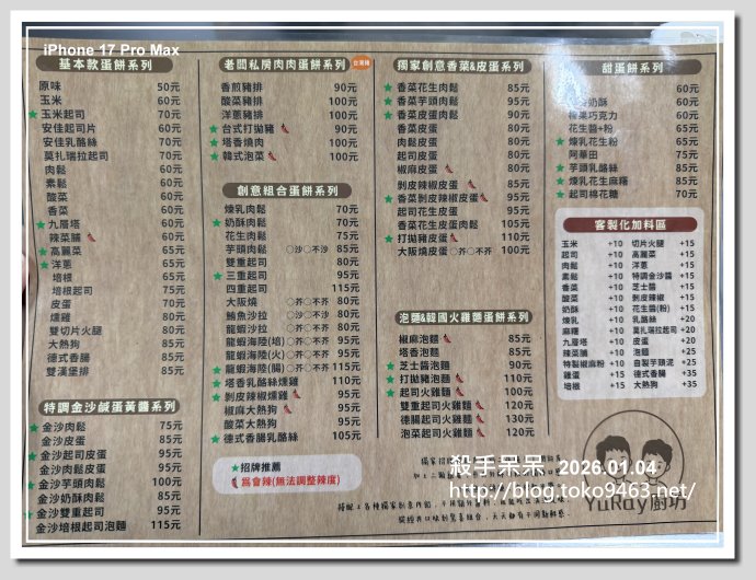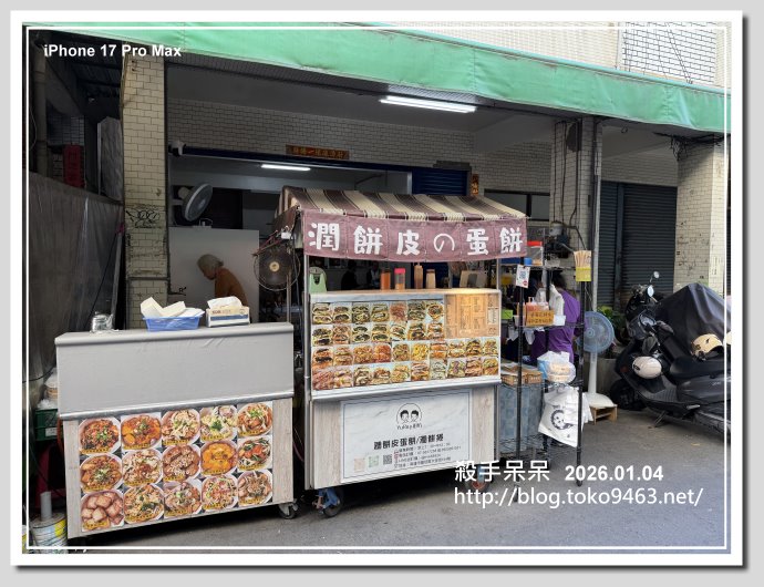 鹽埕區大舞台市場周邊的大安街上有一家早餐攤子外面貼很多蛋餅的圖片!!每一張蛋餅圖片就是代表一種口味……不過店家再往前就是早市!!街道2旁都會停滿買菜的機車,至於開車千萬不要開進來