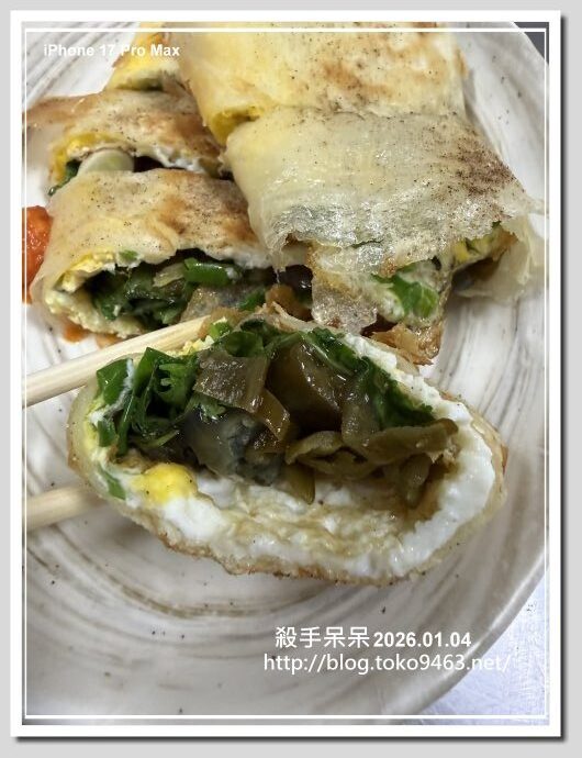 哪3種不是很多人喜歡的食材結合的蛋餅沒有想到卻是這麼搭!!有人不喜歡香菜就是因為香菜的味道!!不過皮蛋的味道力壓香菜與剝皮辣椒,辣度上因為有加剝皮辣椒關係!!辣度似乎被皮蛋濃稠的蛋黃給稀釋,至於價格就看大家的接受度